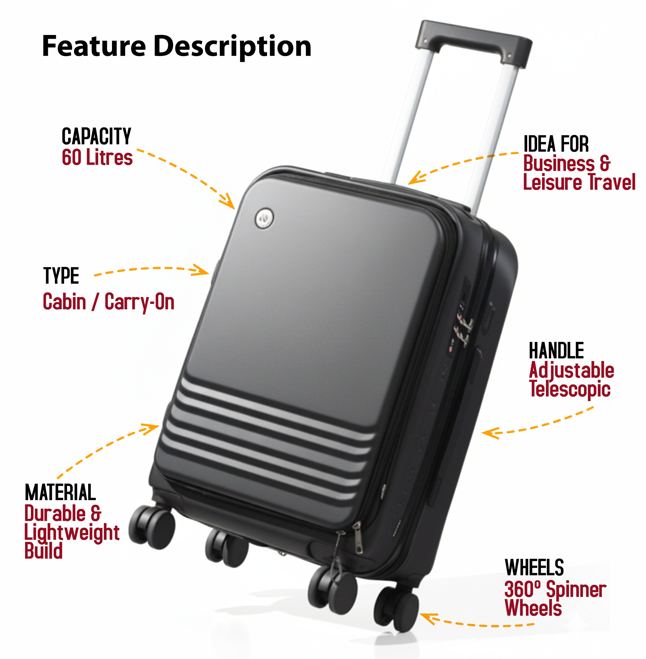 This premium cabin trolley bag is designed for hassle-free travel. With a spacious 60L capacity (22 × 15 × 11 inches), it offers ample room for your essentials while meeting most airline cabin baggage requirements. Built with durable materials, smooth 360° spinner wheels, and a sturdy telescopic handle, it ensures comfort and style on every journey.
